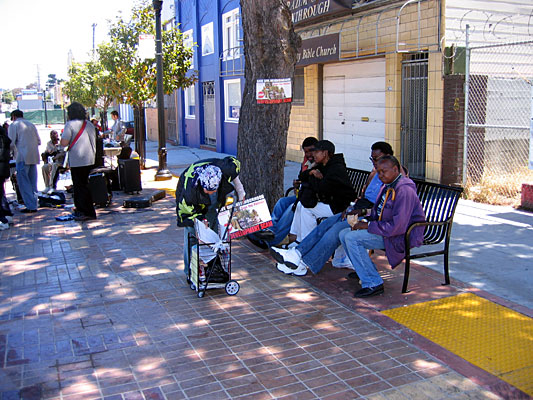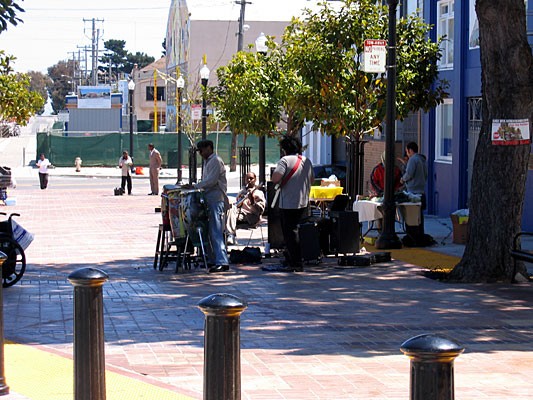 On another table there were some greens, a few plums, potatoes, and a few odd vegetables all coming from some garden but not from a small farm. I looked around and there were just a handful of people and they too were dancing and listening to music. I saw one table where a woman was all prepared to show folks how to cook but no one was interested and the woman was smiling to herself and waiting for an audience but as I said that was it. She and her shadow and more shadows as they passed by her ignoring her. Perhaps the only aspect of this exercise in futility of this Farmers Market was the music and the band that goes by the name of The Hawk Johnson Band. I must say the trio belted out some good music. The few inebriated dancers had all the elements to take them to a higher place and the music as least made them feel good. In the midst of this circus I saw my good friend Minerva Dunn she was out to gather signatures for the impending ballot against San Francisco Redevelopment Agency. We need 21,000 signatures but so far have 19,000 with 4 weeks to go. I guess the fruits of her labor will pay off. I am against SF Redevelopment Agency and especially Eminent Domain. In the Interim this Farmers Market and some outreach done by Arc Ecology wasting over $285,000 a year and some other mostly White Community Based Organizations are busy concerned about mostly people of color. They are concerned about talking about toxic hot spots, what people eat, what they cook, health issues and in attempting to address these issues not one meaningful community meeting has been held. It is always the same crooks wasting money pretending that they care for the constituents of the Bayview Hunters Point. What a freaking joke! Shardha from San Francisco Environment came to me and asked me how come I could not see her waving to me. Well I am like that - I see what I see and at the time of her waving I was guarding some material that Minerva had left me to guard while she took care of some other business. I thought she would be back soon and was getting worried because of the delay and was happy when she arrived to move away and attend to some urgent business on a Saturday. In the meantime I was looking and trying to see what was unfolding before my eyes. The Farmers Market was there - the traffic was lacking but low and behold I saw two members of the Islam of Nation and Shardha told me that they were providing security. What a fine idea I thought. More money for security. San Francisco has the money to pay the band and that is fine. They have the money to pay for security and that is great. They even tried to pay the farmers but the farmers had it because they could not sell their produce and they could not give it away. I know for sure over $200,000 has gone into this project to entice folks to come and buy fruits and produce - to cook and eat right. I know Literacy for Environmental Justice (LEJ) and Girls 2000 stand to again from grants and this project. If the youth benefit from some small stipends it is good but we should see the goals of the Farmers Market attained. I have pondered over this and so far the mission objective has fallen by the way side and into the compost pit. White Folks are funny because they always think they can come into the neighborhood and use the population. Remember on 3rd Street on a Saturday there is some traffic but no one was around this Market not even with the good music. What brought me to the site was the music. It was nice to meet the band leader and my good friend Shardha that worked hard to make this project and the grants available. I had a talk with Gail Myers she is the Project Director and I hope to meet her one of these days to find out more about this failed venture. Gail lives in Oakland and has little interaction with the community and those that really matter. Here we go again the blind leading the blind on some important matter that should matter to the community. LEJ and Girls 2000 do not represent the community in toto they are on the fringe and dubious in nature when it comes to project and more to SFE funding. |