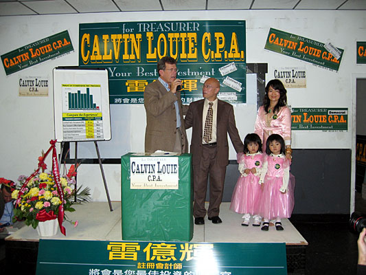 The Chinese community is strong in San Francisco and should turn up in their thousands to vote for this honest man. So too the thousands of other San Francisco constituents that treasure an honest Treasurer and one that will bring money in and make good stuff happen. We are fed up with dishonest folks that have screwed our City and its fiscal state of affairs in the Treasurer's Office. Jose Cisneros has been hand picked to replace Susan Leal and both of them have a hidden agenda. The San Francisco Chronicle has revealed to the world that the present Treasurer has been waiting to pay his property taxes. I also know that the present Treasurer has the lowest amount of taxes collected when he could have done better. His days are numbered and we want a good, honest, hard working man like Calvin Louie to bring in the millions of dollars that have not been collected in taxes. We are fed up with excuses but want action and a Treasurer with a vision, intelligence and the will to do what is right. Mayor Gavin Newsom is playing dirty politics and we want him to stand aside and give a good man with family values a chance to serve San Francisco. Calvin Louie believe me is a trusted professional. He has been a California State Certified Public Accountant and in charge of his CPA firm for over 26 years. He has a lovely wife and two lovely children. Calvin Louie has served on various Commissions but more he has served the poor and those that did not have bank accounts. Folks that could not balance a check. He is a peoples' person and very sincere. I do not see that type of sincerity in the other candidates. I see cronies and crooks that will do the bidding of those corrupt politicians in power. We need a Treasurer that can invest the City's Assets and have full Fiscal Accountability. More is we need a Treasurer that is not full of Spin and Lies but the Truth and Honesty? I see Calvin Louie doing the City and County of San Francisco proud. A graduate from University of California Berkeley, Calvin Louie has many years of experience and has audited thousands of individual accounts, the City's accounts and those of large businesses, the San Francisco Airport, BART, the SF City Controller's Office, and the Health Service System are but few of the many large accounts that he has audited. Calvin Louie has the ability to bring in the money and help get rid of the deficit that our City has today. The other candidates talk the talk but cannot walk the walk. Let us vote for Calvin Louie a man for the masses and who has worked with the masses. There is nothing snobbish about this good man. He is very simply but extremely intelligent when it comes to money, accounting, investing, tax recovery and fiscal operations. He has grassroots support where ever he goes. The time has come for the City and County of San Francisco to have a good man and a knowledgeable Treasurer. We have one is Calvin Louie. Let us be proud that in today's world full of corruption and dishonesty, where family values are down trodden a man like Calvin Louie can stand up and say I will take the reigns and make good stuff happen for all of San Francisco and all San Franciscans. It is time we have an Asian American to represent the thousands of Asians but more to invest the money that so many Asian and other businesses give to the City and County San Francisco and which is poorly invested. Have a one on one talk with Calvin Louie and I bet you will agree with what I have stated in this article. Ask him the hard questions and watch him answer you with easy and look you straight in the eye. In recent years folks like Susan Leal, Bevan Dufty, Jose Cisneros, Tom Ammiano, Virginia Harmon and the likes of them have been trying to vie for certain slots in Public Office more so to divert the attention of good government and propagate a false and hidden agenda. Most of them are inept and lack honesty. I have been saying this openly. I have talked to this honest man Calvin Louie and I see him winning but he cannot do that if we sit back and do not work to make good stuff happen. His wife and children love him, we all love him, now is the time to bring this man into the Treasurer's Office and set the fiscal records of our great City straight. For too long have crooks mismanaged the Treasure's Office first it was Susan Leal and now Jose Cisneros. Vote for a Certified Public Accountant, with over 30 years of experience, a family man with strong values, he is very hard working and will do our Great City proud. Vote for Calvin Louie as Treasurer of San Francisco. |