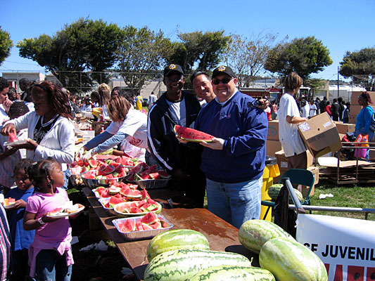 I was there the first year Mobilization for Adolescent Growth in our Communities (MAGIC) put on an event and gave away over a thousand backpacks and I was there this year. This year hundreds more came to join hands with friends on a nice sunny day in the Bayview. There was lots of food and I saw some folks work very hard to carve out some choice pieces of watermelon tasty too. There were lots of hot dogs and drinks to quench the thirst of the many youth who were having fun running and enjoying the many fun games. Kudos to the many volunteers and I count myself among them. It is the sacrifice that makes the love all the richer. The Elders were having fun too not so much running about the place but having a sense of security and knowing that all was well in the community. Meeting and talking to friends. There was a time when all the various neighborhoods in the City and County of San Francisco had fairs, gathering, games, and a host of events that brought people together. Over the years this changed and I am glad that now those that value the communities are rallying behind events such as MAGIC. Last Saturday there was such an event in the Visitation Valley and thousands came and had a good time. Before that we had the Brown Bombers events and put our best foot forward. Now it is MAGIC all over again and the youth feeling loved and happy. I always will spend my time talking with folks and trying to catch a moment that my camera will say more. I thought the two Probation Chiefs with Jeff Adachi who is our Public Defender said it all with the smiles and the watermelon. The crowds surrounding them were having a good time and that is what the event was all about. Over a thousand youth and more from 5 years to 17 years got a backpack. They won other prizes too and took home lots of fun gifts that the many agencies were giving away. I took some from the Museum of the African Diaspora and the folks at the table recognized me from an early article that I had written. Youth Community Developers had a table and so did Brothers Against Guns. San Francisco Public Utilities Commission was there giving out gifts and we also had the San Francisco Zoo bring out some animals for the children to have fun with. Many other Community Based Organization was vying to spread the good word and offer services. That is what it is all about serving our youth and offering quality services especially when one rakes in money from the City through grants. I met many old friends and they were happy to learn about the Environmental Issues that I fight so hard for in the Bayview Hunters Point but also all over the City and County of San Francisco. I also love our youth and join with stalwarts such as John Nauer, Jeff Adachi and others to make our world a happy place. I had a good time and I am sure many others felt the way I do. We all look forward to another MAGIC event full of fireworks and fun. |