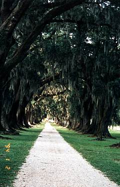 Evergreen oaks with Spanish moss line path leading to slave quarters.