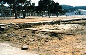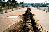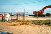 | Here is where they have been excavating Ohlone burial grounds. On the left is a deep trench that was dug to find the outskirts of a burial mound over 200 feet long. In this trench they found artifacts and shells. In the center photo the machine is excavating huge amounts of soil without any monitors present, in an area where a burial mound was found in 1840. In the photo on the right old utility pipelines are being removed by Pacific Bell for a new fiber optic utility corridor. This area has shells all over the place and was once densely inhabited. |