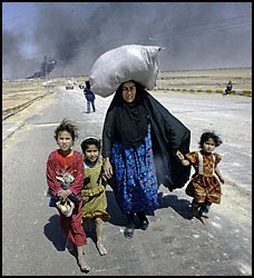 This war has created a mass of refugees and in doing so thousands of innocent children is dying. We cannot simply say boldly we support smart bombs, bully, and kill thousands. We should not feel good when destroy without any compassion. We felt bad when the majority of Saudi nationals plotted to kill thousands who were innocent victims in New York - the twin towers. Yet today we are instrumental in doing the same and much more all in the name of reasons that are focused on greed and oil. Today this war has forced thousands to go hungry. Many others have no clean drinking water. Bombs have ruined Water Plants and so there is no clean drinking water. Sewage Plants have been blown and raw sewage in flowing in rivers and everywhere. The burning oil is polluting the air. The ammunition that is raining down every single day is the source of toxins that are putting millions in harms way. How can we choose in all decency to destroy the infrastructure of Iraq and then plan to rebuild Iraq? This logic makes no sense and we, as a Nation will have a heavy price to pay in the years to come. We cannot import our democracy just because we think we can import it. True democracy at home should have been kind to the Native First People many of whom are on poor reservations. Others are NOT recognized and on the Federal Register. Millions of poor young men and women lingering in our jails. We have more money for jails and less money for education. We have no money to take care of health programs. Many of our seniors have no food and find they have to pay huge sums of money for medicine. Some of us understand that war brings out the worst that we humans harbor and that war by definition is evil. There has never been a war that was initiated as this war is without clear definition - which has brought good. This war is evil and the consequences of the action of the extreme right will reap the fruits linked with evil. We cannot say with a clear conscience that we do not care about innocent children and women as a consequence of our well-planned war effort. Today our key war planners fail to understand how our own forces and not fed well and in some cases do not have clean drinking water near the enemy and miles away from safety. We feel lost when the Iraqi protest and put up a fight. We cannot understand when things do not go our way. We are so used to our fast food mentality - where on demand you get what you desire on a platter. We fail to understand that the millions who died from the Civil War down to contemporary times for true freedom - did not have in mind this type of war where most genuine Americans do not approve the methods used against a people who are pitted and inferior in the possession of war equipment. When will we learn to wise up and use the maturity of our elders to learn from babes about peace? We have not done well in Afghanistan and still do not have control of the countryside. Can we really stay in Iraq and waste billions just so that some of our leaders make billions selling oil? We have to be vigilant that we do not created refugees who will be poor for years to come. It is from this type of environment that terrorist are born. It is from the bowels of refugee camps that hatred in spread all over the world. Evil begets evil and it is time that we reason that indiscriminate bombing just as we have done in Iraq - is plain wrong. The refugees we have made happen deserve our help and compassion. |