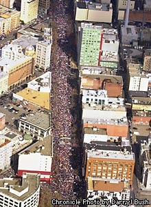Over 400,000 people from all walks of life marched down Market Street and gathered around the Civic Center to hear speeches from activists denouncing President Bush proposed war on Iraq.