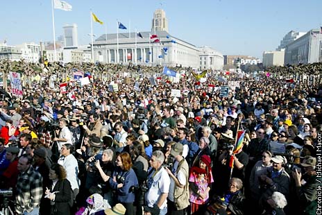 As many as 120,000 people marched along Market Street to the San Francisco Civic Center to send a very clear message to Washington DC - the people united do not want the United States to engage in a full blown war with Iraq. We want peace and better economic times.