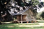 | Evergreen plantation has over twenty-five slave houses neatly built in a row. Neatly planted are the famous Evergreen Oaks with their hanging Spanish Moss. Most of the slave houses or quarters are being rehabilitated today. We were given the opportunity to enter one and take photographs. (article; photos.) |